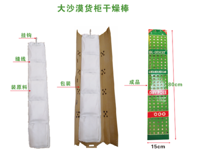 大沙漠貨柜棒能有效的吸收空氣中的濕氣從而保護 輸途中的貨物,濕氣減少后,使其周圍環(huán)境中的相對濕度降 低,從而保護該環(huán)境中的產(chǎn)品或物質(zhì)免受潮濕損害。